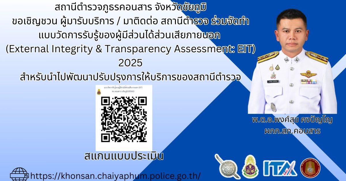 พ.ต.อ.พงศ์สุข คงปัญโญ ผกก.สภ.คอนสาร ขอเชิญชวน ผู้มาใช้บริการ/ผู้มาติดต่อราชการ ร่วมทำแบบวัดการรับรู้ของผู้มีส่วนได้ส่วนเสียภายนอก EIT ประจำปีงบประมาณ 2568